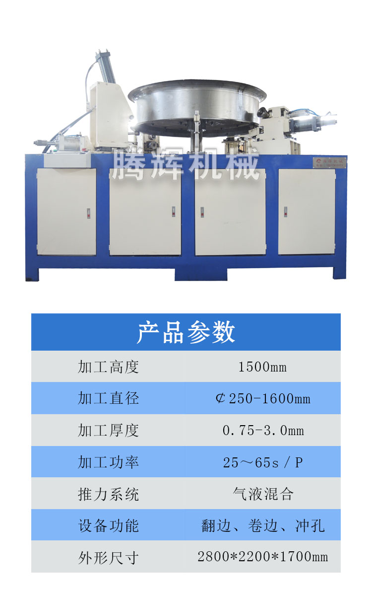 本文介紹的設(shè)備專用于軸流風機外殼的翻邊沖孔機,加工直徑范圍可達1600mm,該機器操作簡單,更換模具快捷,能耗低、效率高,一人操作即可完成風機翻邊、卷邊、打孔的制作。(公司根據(jù)客戶需求,為客戶量身定制適合的設(shè)備,歡迎新老客戶咨詢了解)